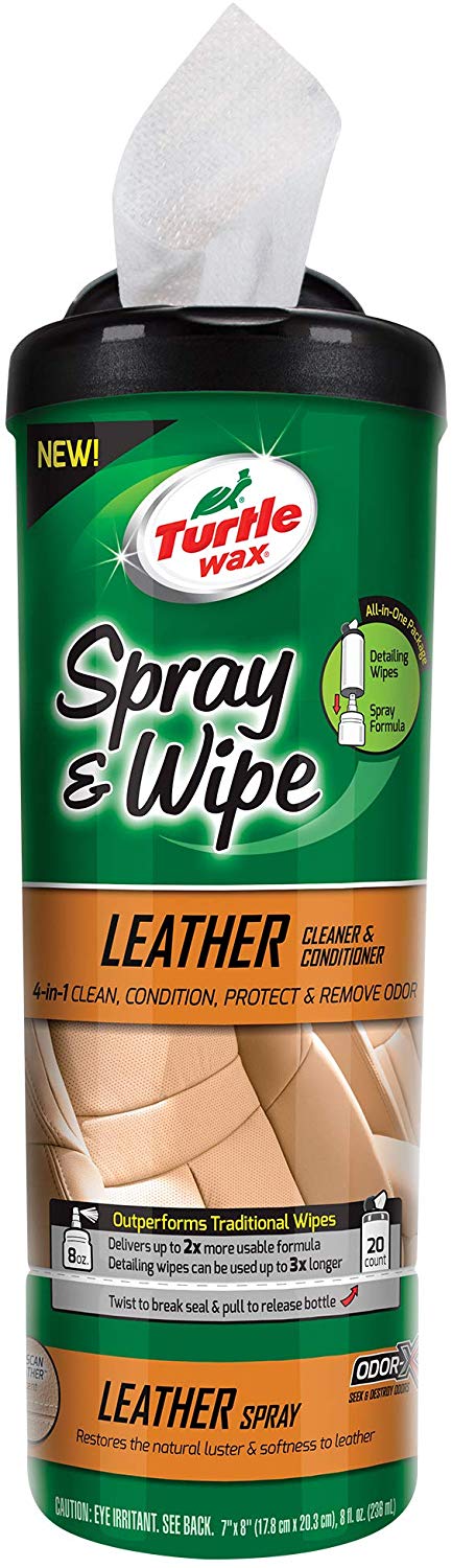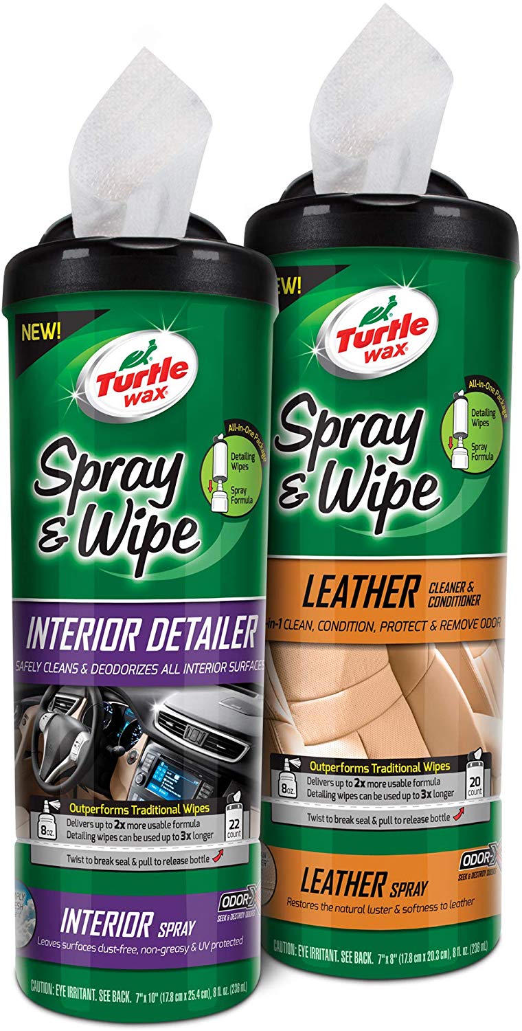 Includes Spray & Wipe Interior Detailer and Leather Cleaner Combines the performance of the traditional spray trigger and microfiber towel with the convenience of the automotive cleaning wipe Simply twist the canister at the perforated line to pull out the innovative formula Spray & Wipes won't streak or dry out and will last longer than traditional wipes Safe to use on all interior surfaces and leather interiors